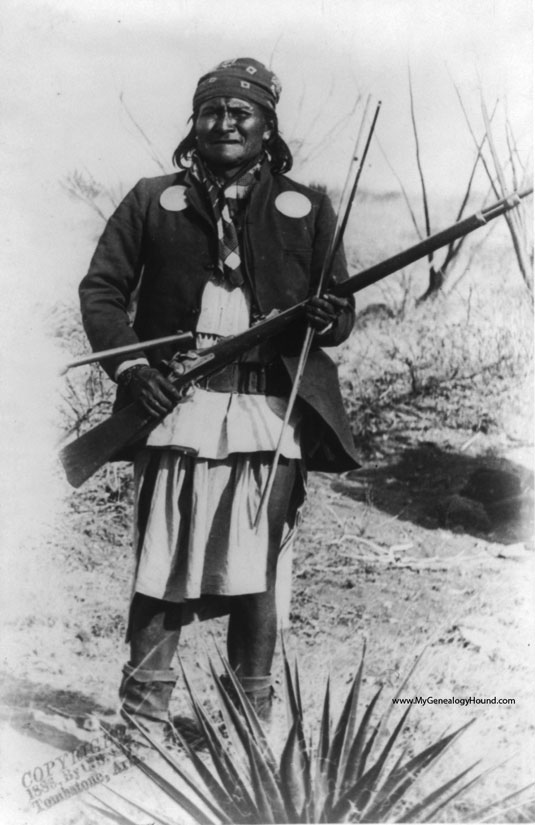 A photo recorded by C. S. Fly, just before Geronimo, the noted Apache Medicine Man and warrior, surrendered to General George Crook on March 27, 1886. (This is part of a larger photograph; see the photo at the bottom of the page for the full view.)