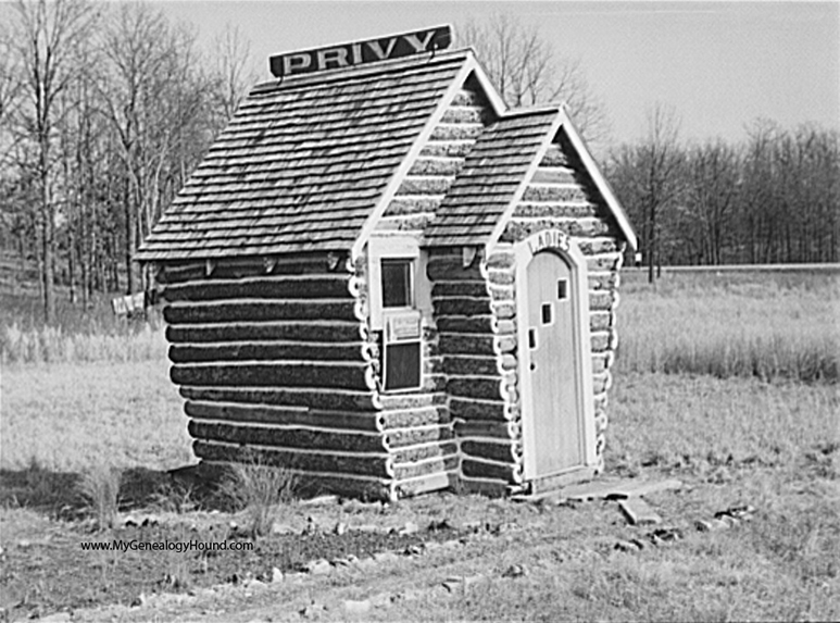 A historic photo view of an elaborate "privy" for the ladies. This photo is of an undetermined location in Shannon County, Missouri. The photo is by John Vachon with the U.S. Farm Security Administration, February 1942.