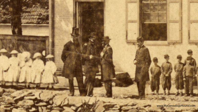 Standing in front of the Soldiers' Orphan's Homestead building are four men: Gen. Samuel W. Crawford, Gen. Andrew Porter, Gov. John W. Geary, and Gen. Ulysses S. Grant. The orphan children are lined up with girls on the left, boys on the right..