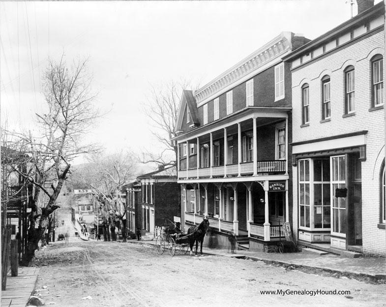 A 1906 photo of a street scene in Luray, Virginia. The large, dark colored building at the right is the Mansion Inn Hotel.