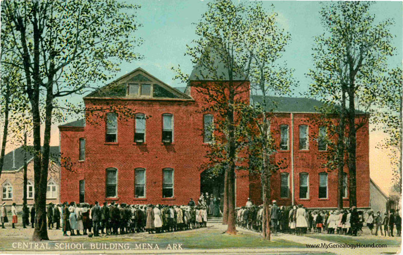A vintage postcard of the Central School Building, Mena, Arkansas.
