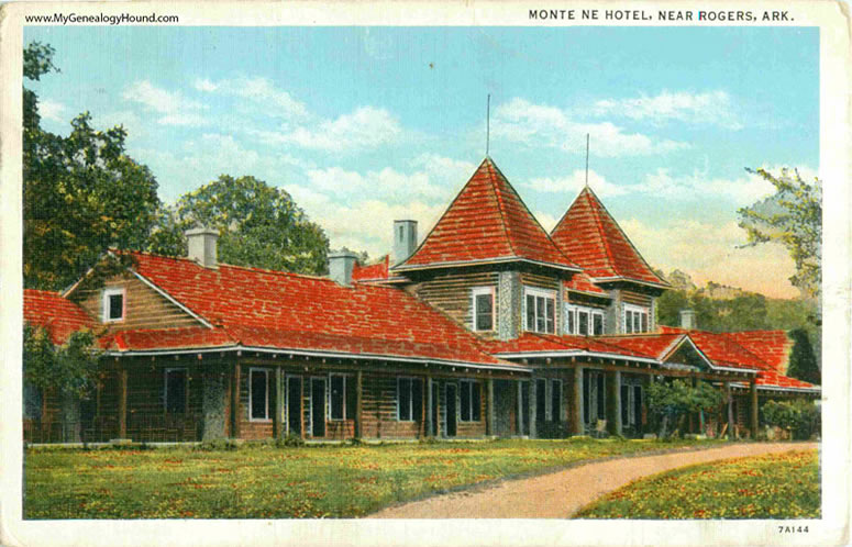 A vintage postcard of the Monte Ne Hotel at Monte Ne, Arkansas. Monte Ne was established in 1901 by William H. "Coin" Harvey as a resort community. Beaver Dam forming Beaver Lake in the area flooded most of the former Monte Ne resort area.