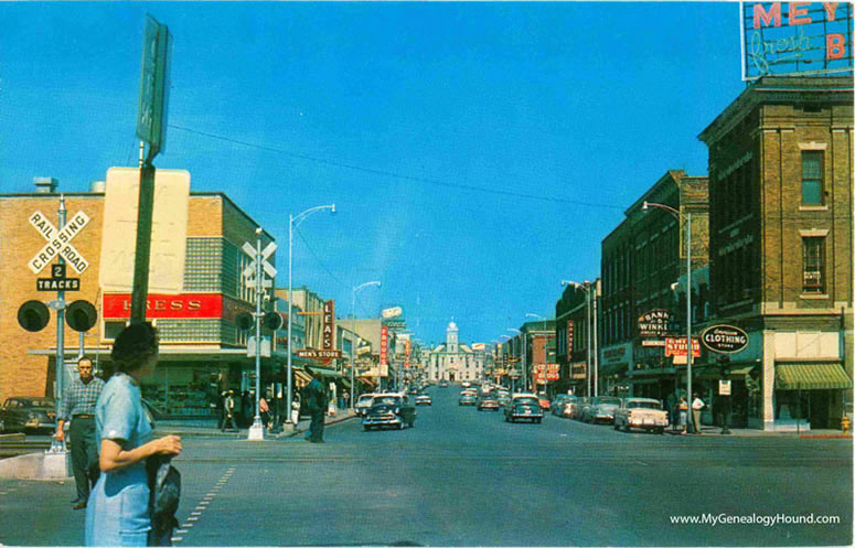 A vintage postcard of Main Street Looking North, Pine Bluff, Arkansas. A wide range of store names are included in this view. The Jefferson County Courthouse can be seen at the end of the street.