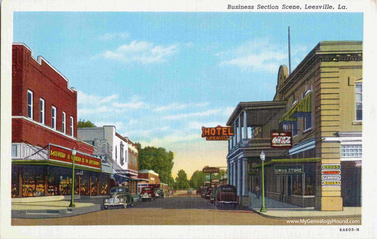 A vintage postcard view of a Business Section Street Scene, Leesville, Louisiana. Business signs that can be read include Hotel Leesville; Drug Store; Morgan & Lindsey 5 & 10.