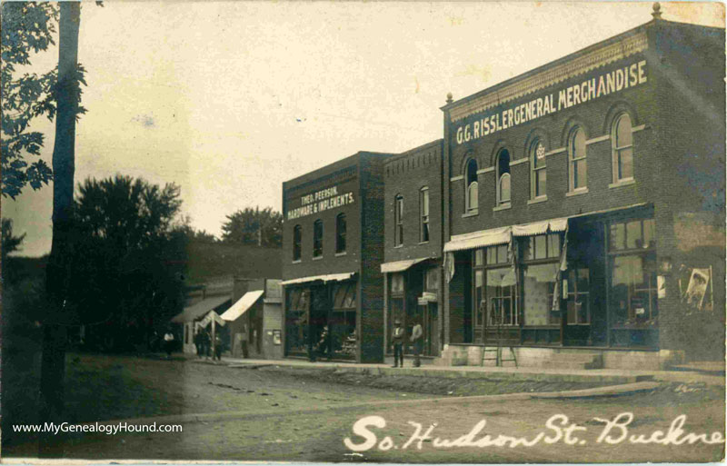 A vintage postcard view of South Hudson Street, Buckner, Missouri. The building signs are G. G. Rissler General Merchandise; Theo. Peerson Hardware & Implements. This postcard view is postmarked in 1907.