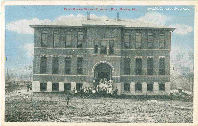 A vintage postcard view of the Flat River Ward School, Flat River, Missouri. This postcard view was postmarked in 1923.