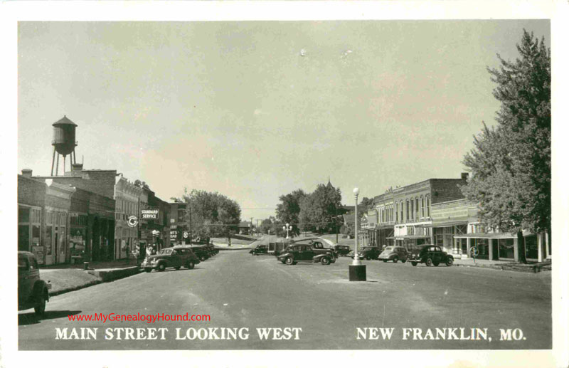 A vintage postcard of Main Street Looking West in New Franklin, Missouri. Signs that can be read include "Standard Service" "Pontiac" "Quaker State" and "Drugs". This postcard view is from the 1940's.